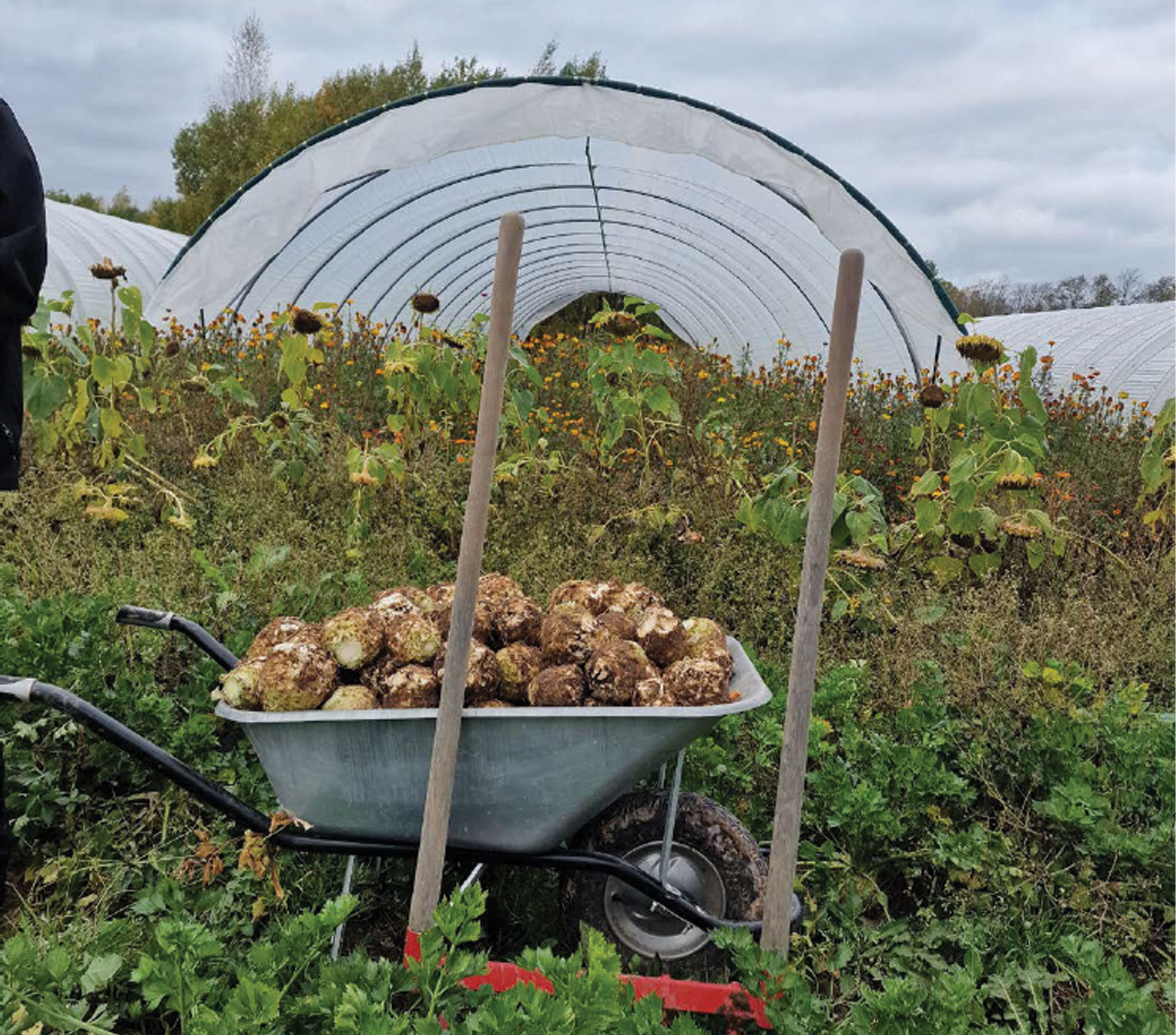 Tā mēs sākām. Taču Latvijā tas īsti neder. Viens no iemesliem ir plaši attīstītā mazdārziņu kultūra. Rēķināmies ar to, ka daļai klientu ir periodi, kad mūsu dārzeņi viņiem nav aktuāli, jo kārotais izaug paša vai radinieka dārziņā. Tāpēc audzējam tā, lai sezonāli ik nedēļu būtu cits piedāvājums. Maijā mums ir spināti, redīsi, pak choi un jaunie burkāni. Pērn maijā bija arī jaunie kartupeļi, mulčējām, lai pasargātu no salnām. Pirms tam mani skaisti sadīgušie kartupeļi maija sākumā mīnus 8 °C visi nosala, lai gan bija apsegti. Labi, ka nebija lielas platības, tādā ziņā mums dažādība atmaksājas. Ja sanāk kādā vietā problēmas, var ļoti ātri reaģēt un kaut ko citu iestādīt vietā. Protams, ir arī jāparaud, bet saņemies, sāc darīt un ej tālāk.