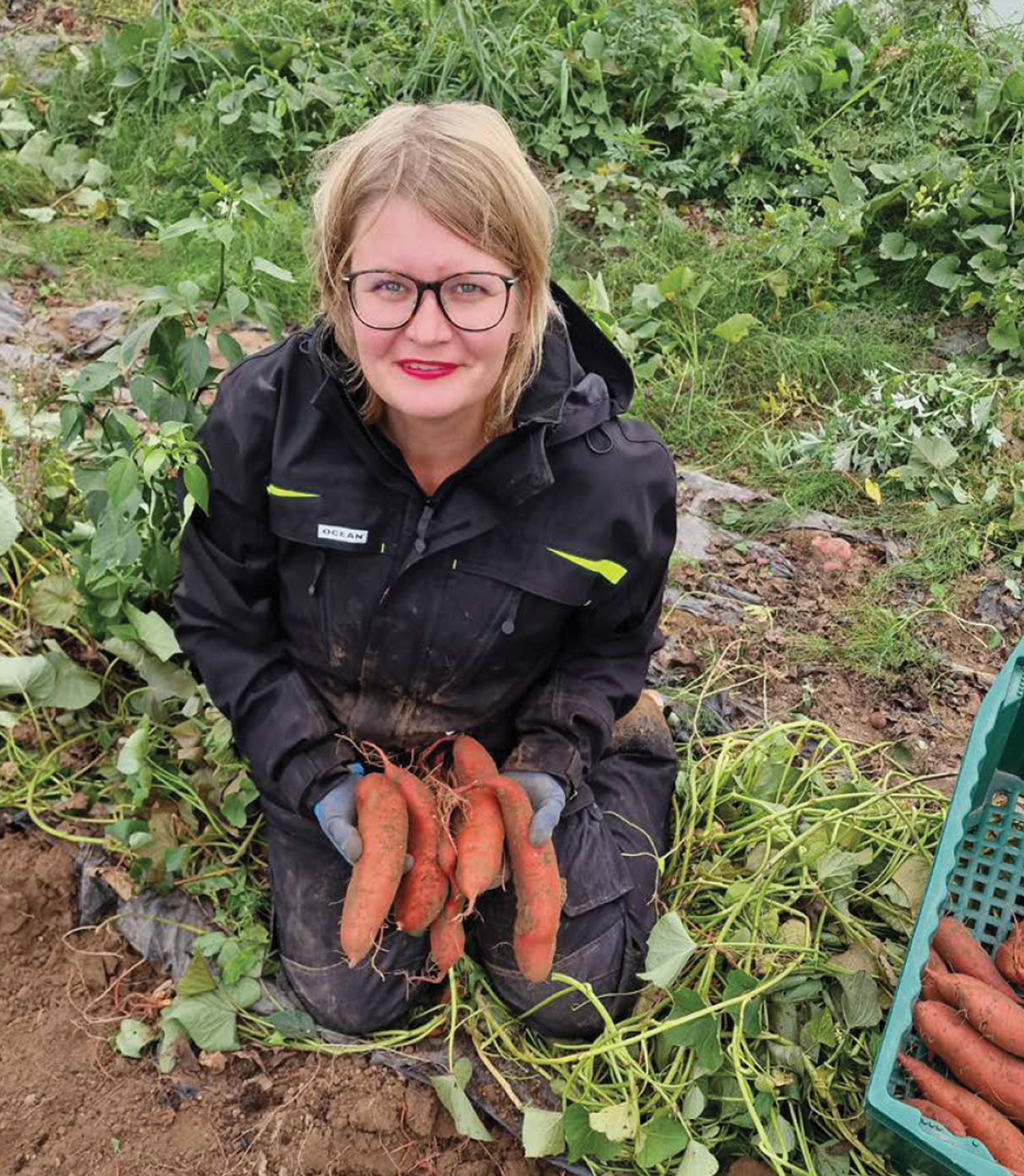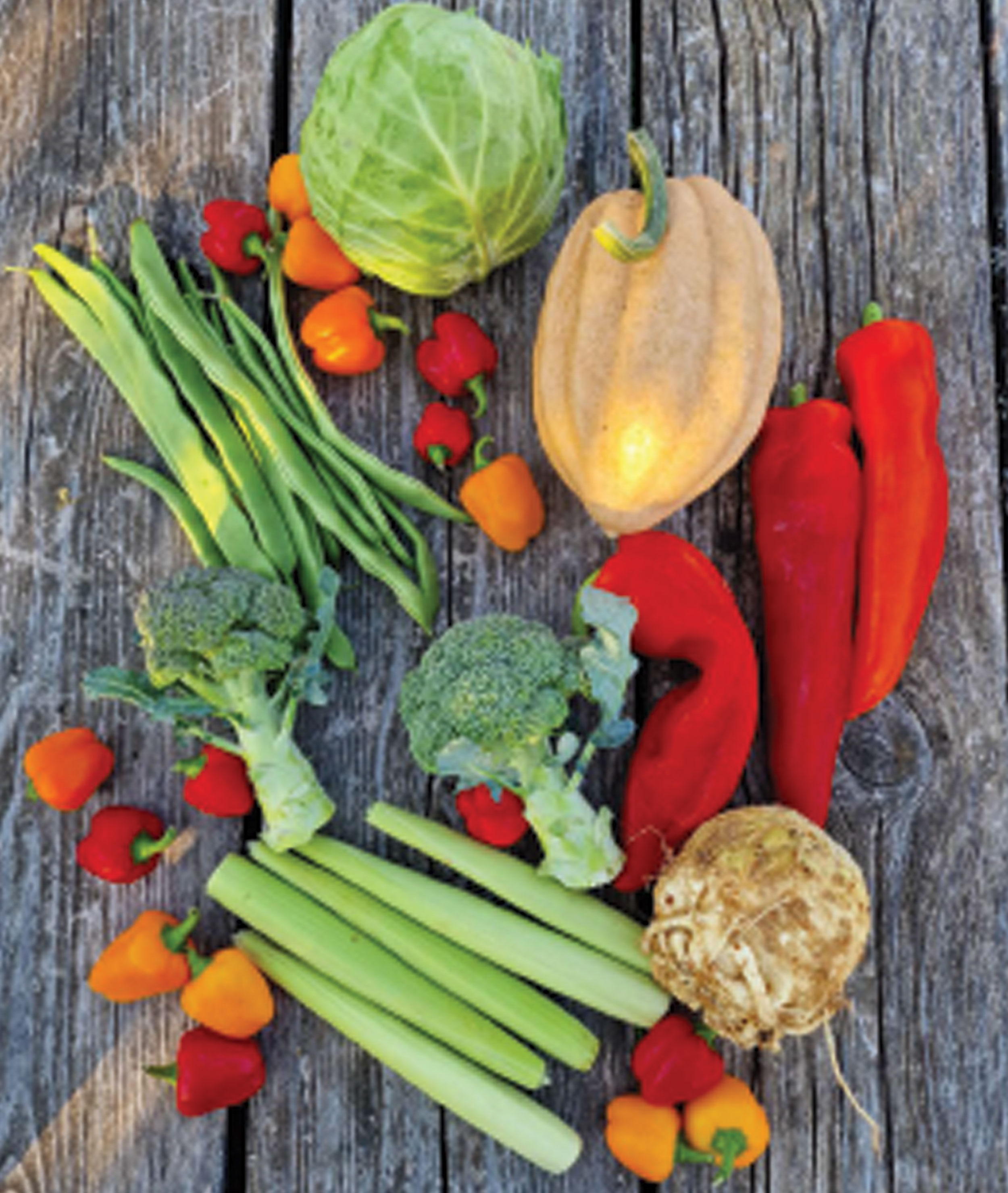 Mēs audzējam praktiski visu, kādas 65 kultūras sastādītas dobēs: kartupeļi, burkāni, sīpoli, bietes, kabači, gurķi, tomāti, pipari, baklažāni, redīsi, spināti, pupiņas, sīpoli, ķiploki, kukurūza, saldie kartupeļi, dažādi garšaugi, kāposti, brokoļi, ziedkāposti, kolrābji, rāceņi, rutki, kāļi, baziliks, selerijas, pētersīļi, dilles, salvija, rozmarīns, timiāns, citronzāle. Varbūt kaut ko piemirsu.