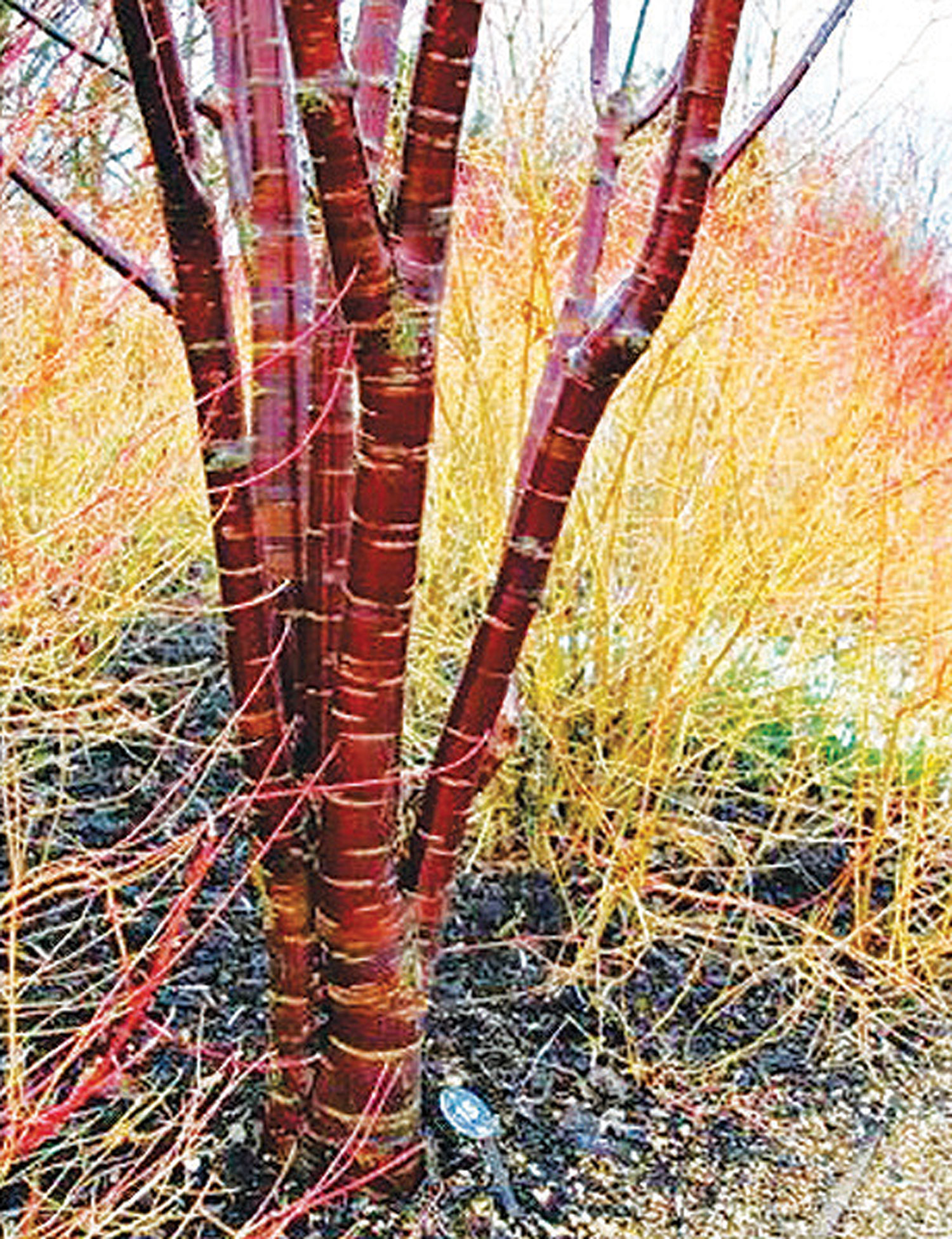 Tibetas ķirsim (Prunus serrula) ir spīdīga sarkanbrūna miza, kas ar laiku paliek izteiksmīgāka.